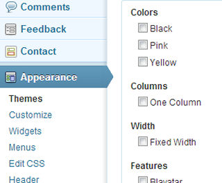 By far, the easiest way to make changes is to change your theme. Just go to the Appearance >> Themes >> tab of your WordPress dashboard. You’ll see a list of available themes in the default tab, with another tab that lets you search for and install new themes. You can specify layout, color, features, and even subject (i.e. intended use) options. When you find one you like, you can preview and install it. Clicking the “install” link downloads the theme to your WordPress dashboard, though in order to use the theme, you must click its “Activate” link.